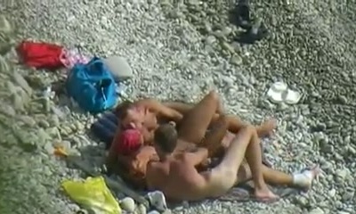 Super-sexy chick and two horny guys enjoy foreplay on the beach when I spy them