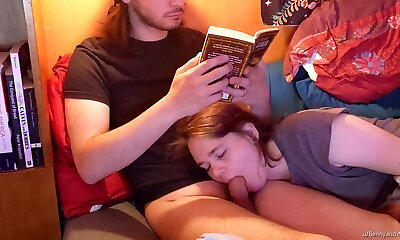 My boyfriend loves to read a book while I keep his cock in my jaws.