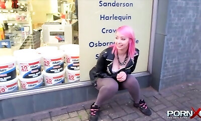 punk aux cheveux roses en rut girlie en pantalon de yoga serré urine à l'extérieur pour le mec