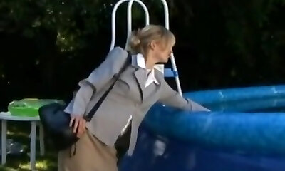 une blonde a poussé l'homme dans la piscine pour qu'il soit mouillé, car sa chatte était déjà en cascade
