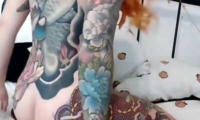 gorgeous tattooed redhead proudly demonstrates pierced tits
