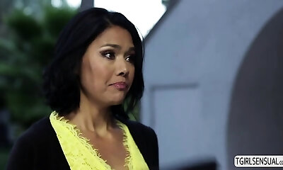 Tranny has big boobs and a dick for this petite dark haired damsel